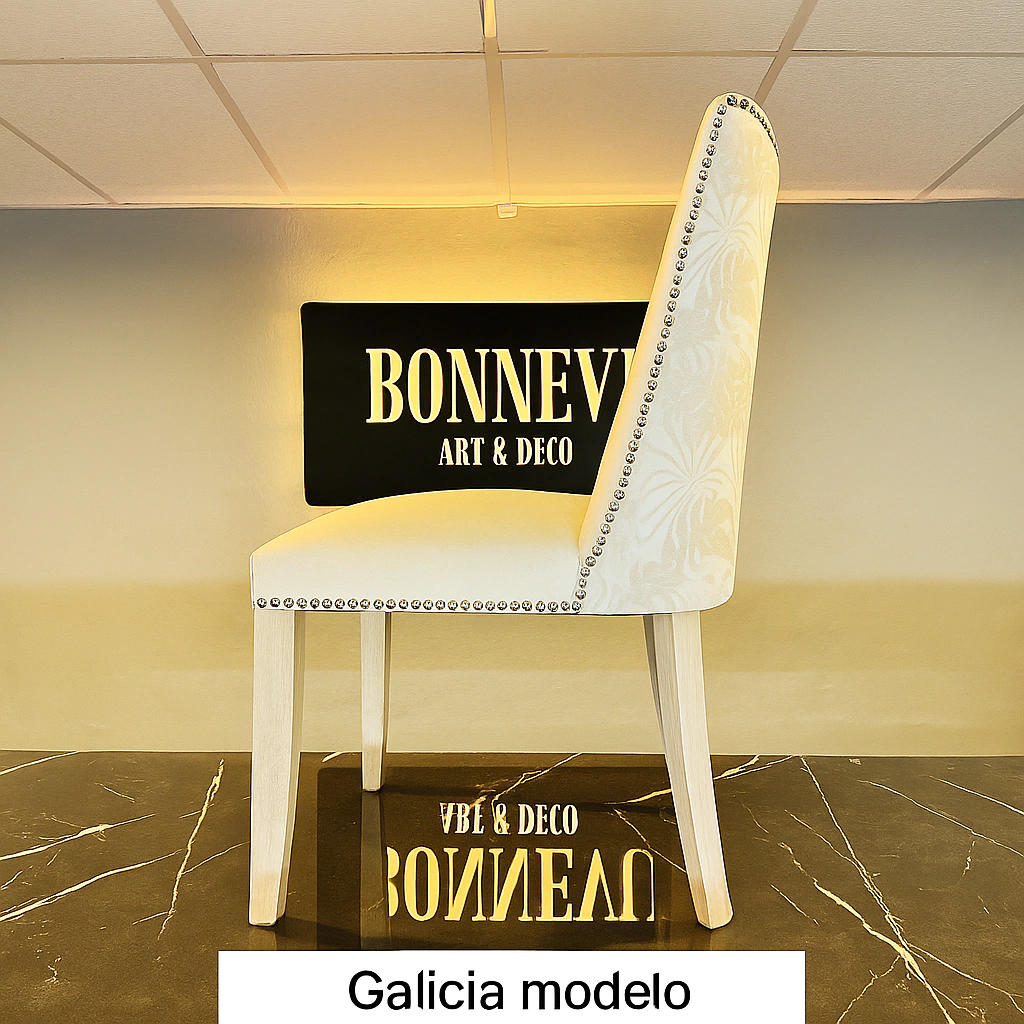Esta silla modelo Galicia, tiene en la parte de arriba del respaldo una curvatura (orejas) mas pronunciadas. Con Capitone en Pana o Lino (color a elección) - Con proceso antimanchas y antidesgarro.